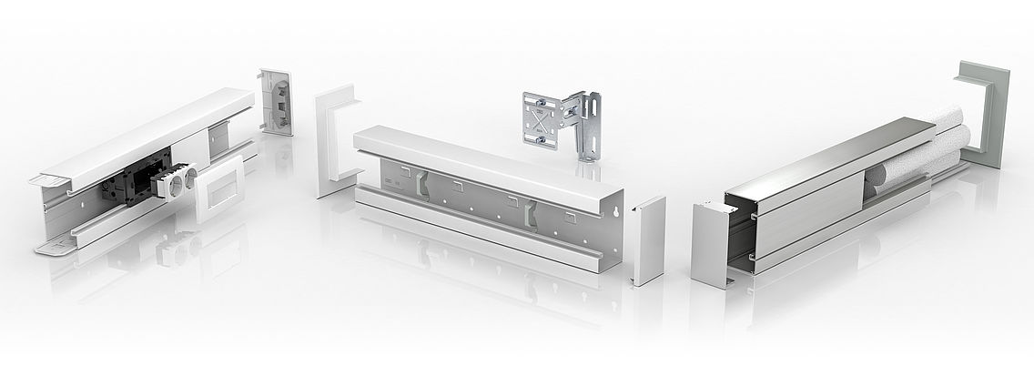 Design e funzionalità uniti in un unico sistema: il canale porta apparecchi Rapid 80. Grazie alla standardizzazione coerente dei componenti di sistema, i tre tipi di canalina – in plastica, alluminio o lamiera d’acciaio – possono essere utilizzati singolarmente o combinati tra loro. Gli accessori e gli angoli variabili sono compatibili con tutte le versioni.