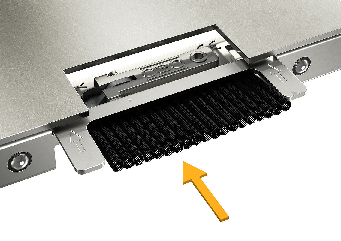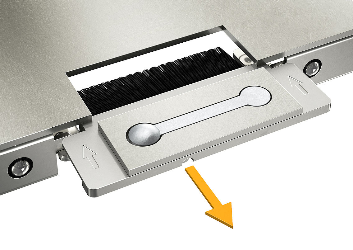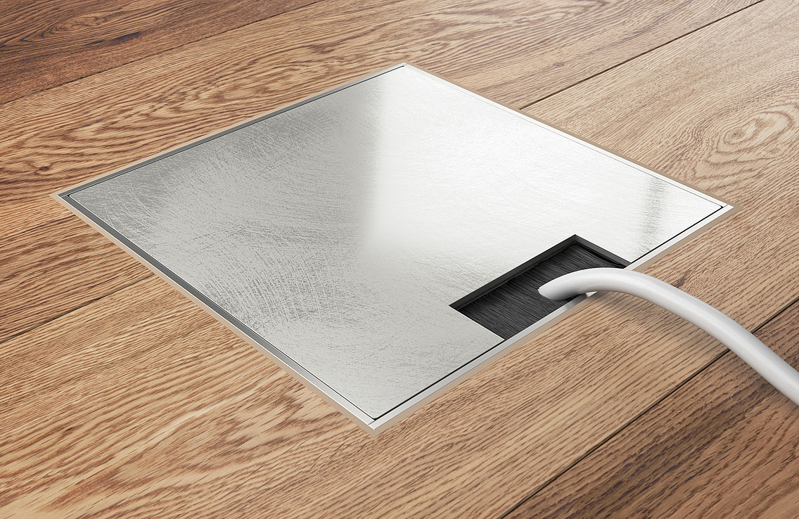 Durante l'uso, i cavi vengono fatti uscire discretamente attraverso l'uscita cavi in setole. Il coperchio con uscita a spazzola brevettato si caratterizza per un design discreto e pulito, integrandosi in modo flessibile e armonico agli interni esistenti grazie alla maniglia di apertura coperchio piatta. Ciò garantisce un'installazione elettrica sicura, soddisfacendo allo stesso tempo standard estetici elevati.