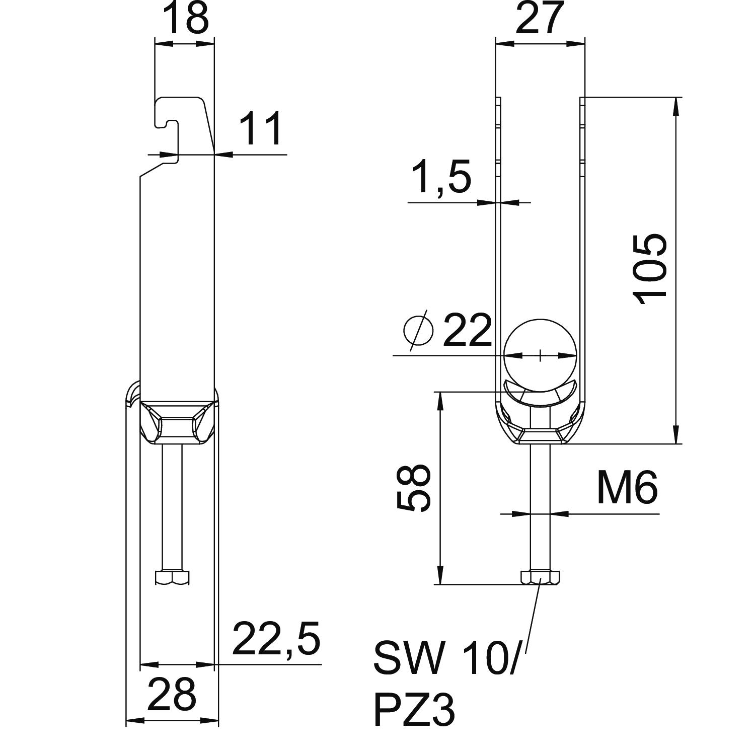 Aggiunta materiale Acciaio Aggiunta superficie zincato a caldo Altezza 105 mm Capacità D max 22 mm Capacità D min. 16 mm Con controcoppa no Con coppa in metallo sì Con coppa in plastica no Dimensione H 105 mm Dimensione 16-22mm Dimensione A 22,5 mm Dimensione B 27 mm Dimensione C 28 mm Dimensione G (mm) M6 Dimensione L 58 mm Dimensione t 1,5 mm Filettatura M6 Impronta CO2 (GWP) dalla culla al cancello 0,1741 kg CO₂e / 1 Pezzo Larghezza 27 mm Larghezza asola 10 mm Lunghezza 22,5 mm Lunghezza esterna 28 mm Mantenimento funzionale sì Materiale Acciaio Materiale della coppa Acciaio Max. Coppia di serraggio 3 Nm Modalità di montaggio Profilati Numero dei cavi/tubi 3 per diametro tubo max 22 mm per diametro tubo min. 16 mm per profilato portacavi con apertura asola (con intervallo) max 22 mm per profilato portacavi con apertura asola (con intervallo) min. 18 mm Priva di alogeni sì Spessore lamiera 1,5 mm Super- ficie zincato a caldo per immersione - Tutti i tipi