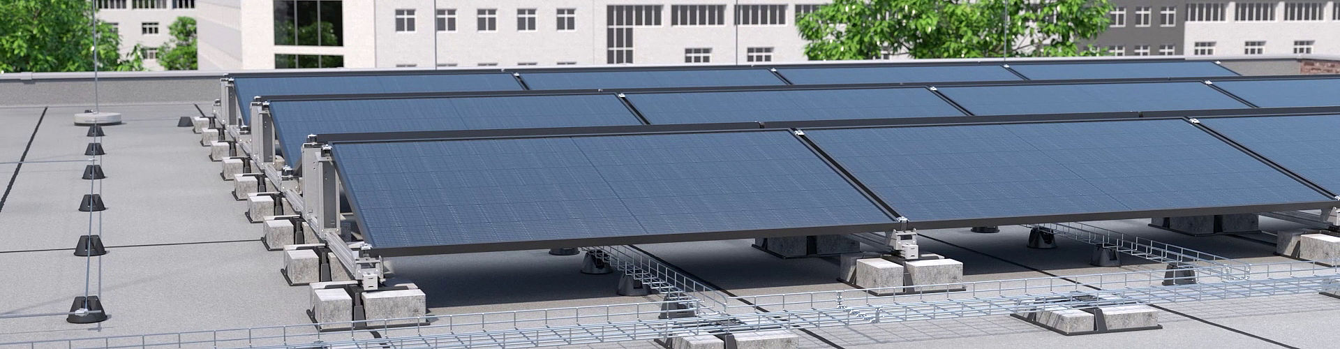 Analogamente al sistema per impianti su tetti a falde, Magic PV Solution per gli impianti su tetti piatti dispone della tecnologia Magic, per un montaggio privo di viti e attrezzi, e del morsetto universale per un fissaggio semplice a tutti i moduli FV in commercio. Inoltre, il sistema di contrappesi UniBase garantisce l'aggiunta di peso variabile su tutto il sistema grazie a pietre da pavimentazione rettangolari, che possono essere applicate in ogni momento anche dopo l'installazione. Il sistema UniBase può essere integrato a piacere con altri prodotti, come l'adattatore per passerelle grigliate di tipo 165 MBG HGRM.